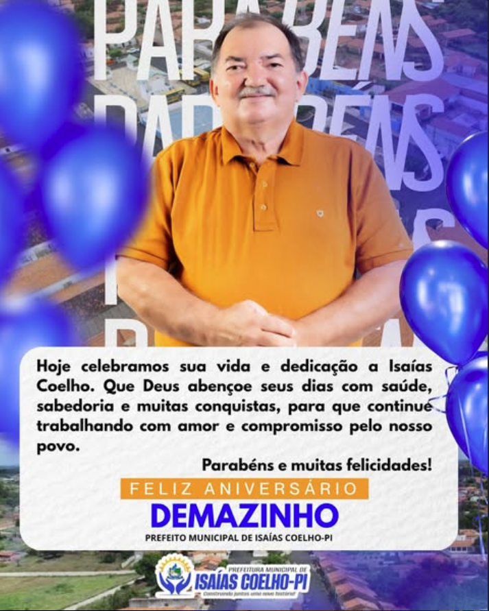 A Prefeitura Municipal tem a honra de parabenizar o prefeito Demazinho pelo seu trabalho incansável e dedicação ao desenvolvimento do nosso município.
