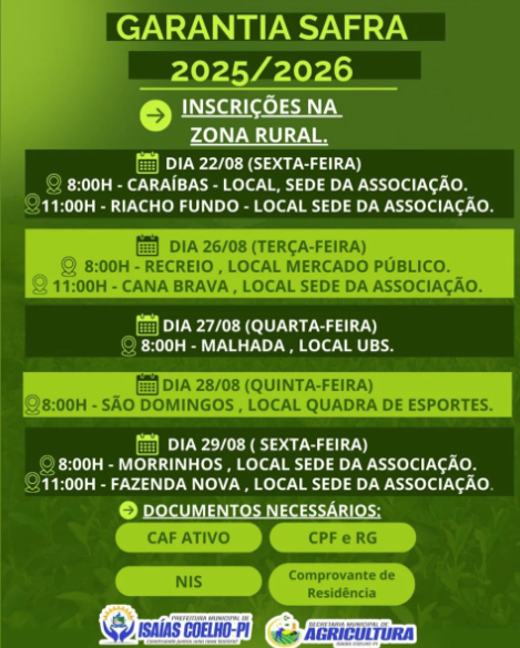 ISAÍAS COELHO-PI – A Prefeitura Municipal de Isaías Coelho, em parceria com a Secretaria de Agricultura, informa sobre o cronograma de inscrições para o programa Garantia Safra 2025/2026. As inscrições ocorrerão na zona rural, seguindo o cronograma abaixo: