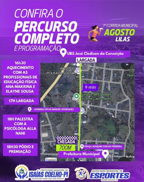 A Prefeitura de Isaías Coelho, por meio da Secretaria Municipal de Saúde, promove a 1ª Corrida Municipal Agosto Lilás, evento que integra a campanha de conscientização contra a violência à mulher. O percurso terá largada na UBS José Cledison da Conceição e chegada na sede da Prefeitura Municipal, com distância total de 700 metros.