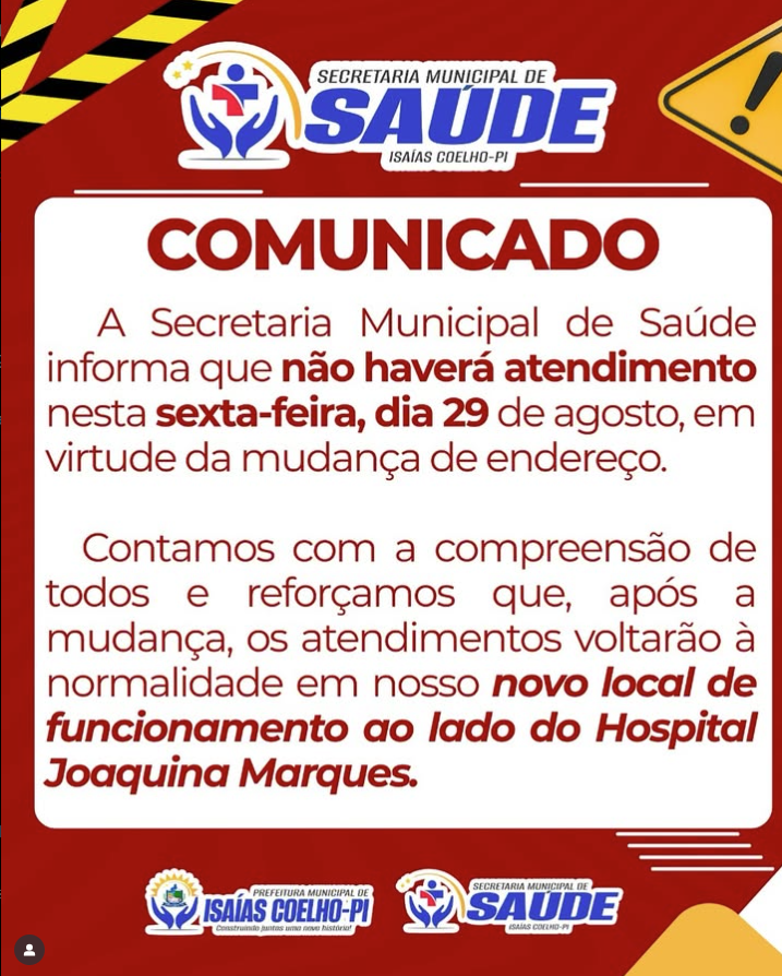 A Prefeitura de Isaías Coelho comunica à população que, nesta sexta-feira (29/08), não haverá atendimento na Secretaria Municipal de Saúde devido ao processo de mudança para um novo endereço.