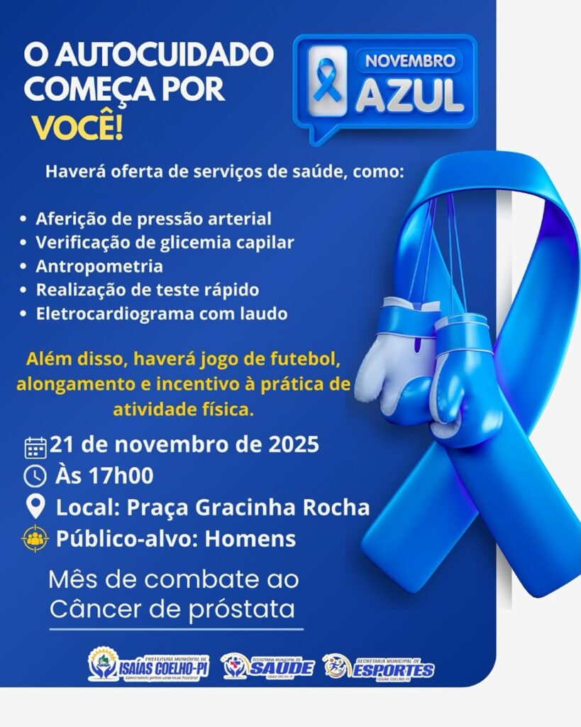 A Prefeitura Municipal de Isaías Coelho, em parceria com as Secretarias Municipais de Saúde e de Esportes, convida todos os homens do município para participar de uma tarde especial dedicada à prevenção, ao cuidado e ao bem-estar, em alusão ao Novembro Azul — mês de conscientização e combate ao câncer de próstata.