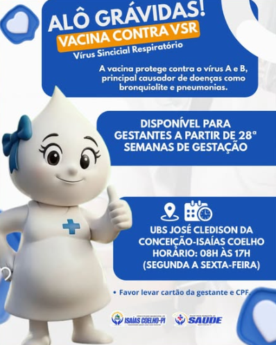 A Prefeitura Municipal de Isaías Coelho, por meio da Secretaria Municipal de Saúde, informa à população sobre a disponibilização da vacina contra o Vírus Sincicial Respiratório (VSR), destinada às gestantes como medida fundamental de prevenção e proteção à saúde materna e infantil.