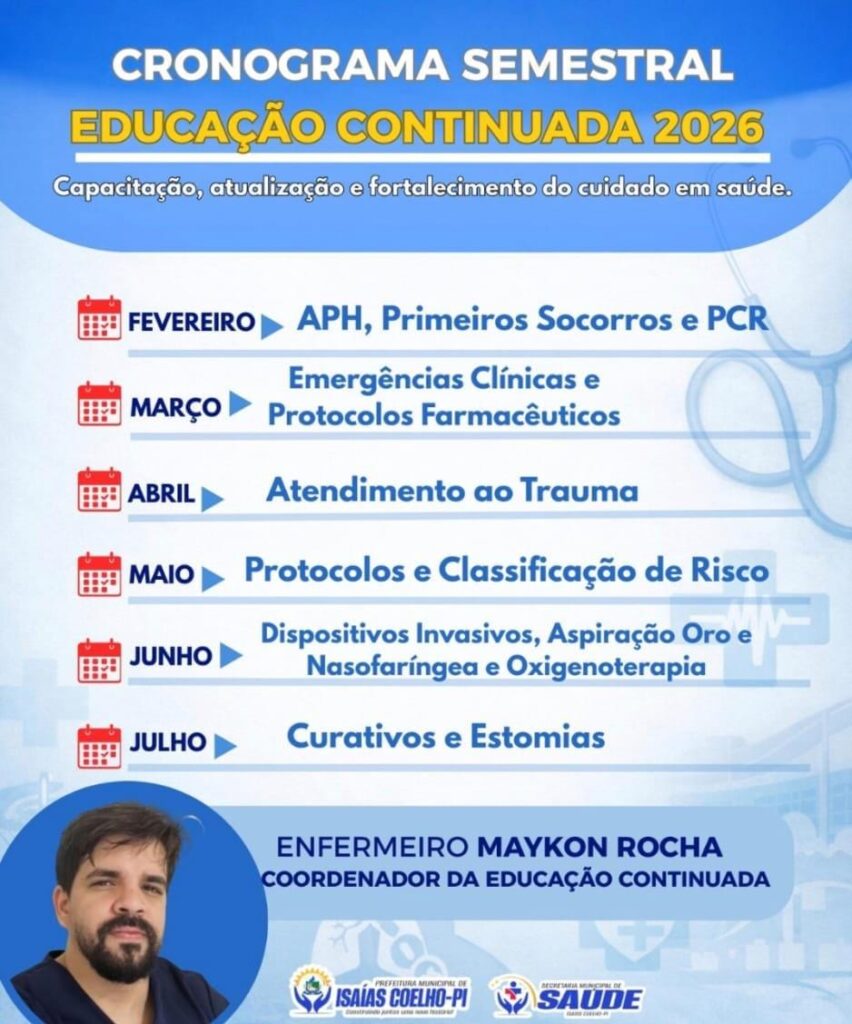 A Secretaria Municipal de Saúde de Isaías Coelho (PI) instituiu o Cronograma de Educação Continuada para o ano de 2026, com o objetivo de fortalecer a qualificação profissional, aprimorar os serviços prestados e garantir um cuidado em saúde cada vez mais seguro, humanizado e resolutivo à população. As atividades serão coordenadas pelo enfermeiro Maykon Rocha, responsável pelo planejamento e acompanhamento das capacitações.