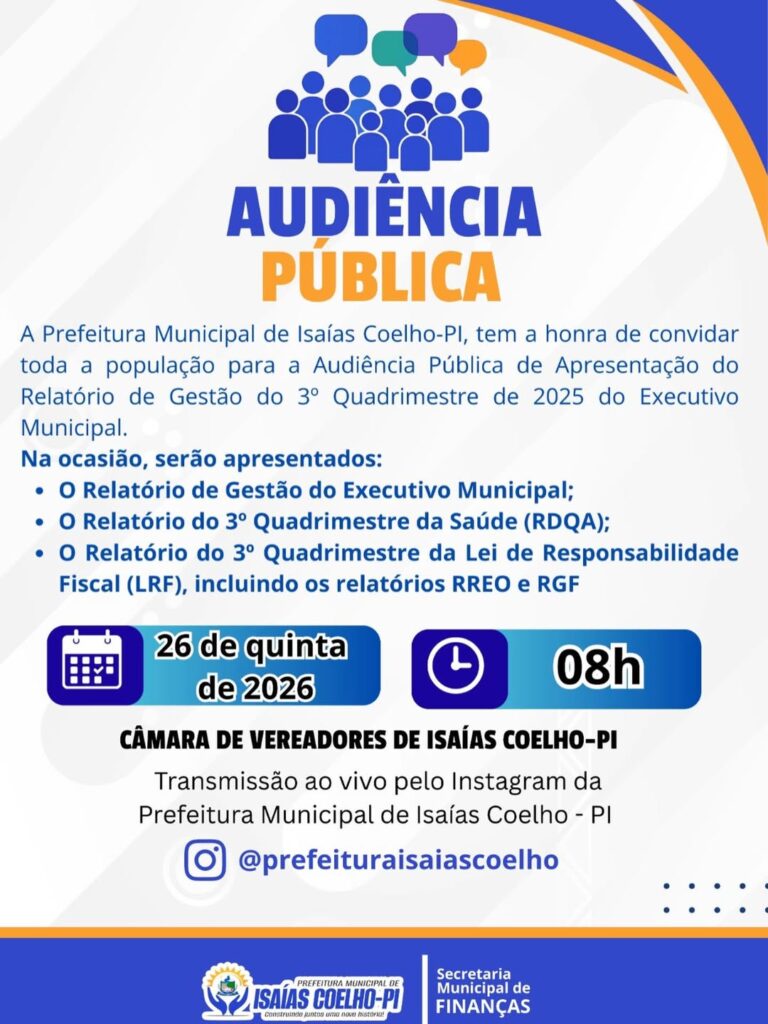 O encontro será realizado no dia 26 de fevereiro de 2026 (quinta-feira), às 8h, na Câmara de Vereadores de Isaías Coelho. A audiência também contará com transmissão ao vivo por meio do perfil oficial da Prefeitura no Instagram, ampliando o acesso da população às informações apresentadas.