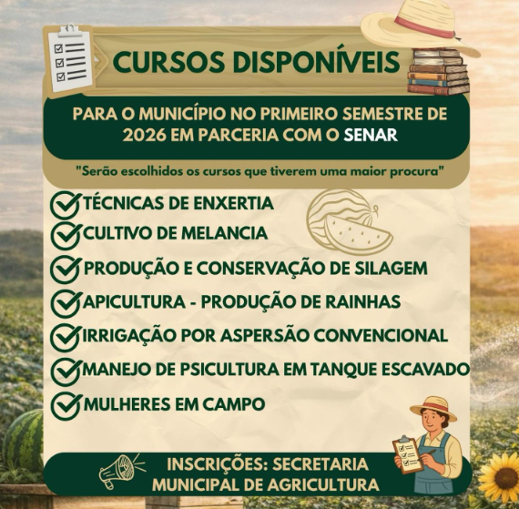 A Prefeitura Municipal de Isaías Coelho, por meio da Secretaria Municipal de Agricultura, em parceria com o Serviço Nacional de Aprendizagem Rural, informa que estão disponíveis cursos de capacitação voltados ao fortalecimento da produção rural no primeiro semestre de 2026.