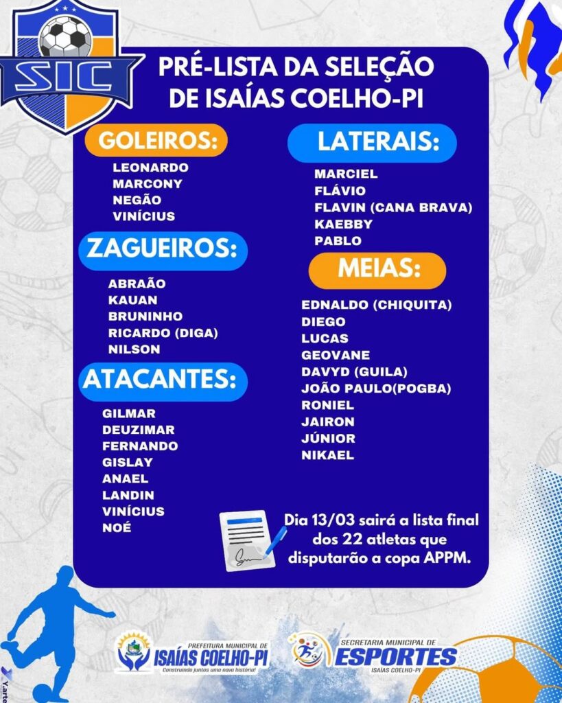 A comissão técnica da Seleção de Isaías Coelho definiu, na última sexta-feira, a pré-lista de atletas convocados para disputar a Copa APPM 2026. A equipe segue em preparação para a competição, que terá início no mês de abril, com a estreia da seleção marcada para o dia 12/04.